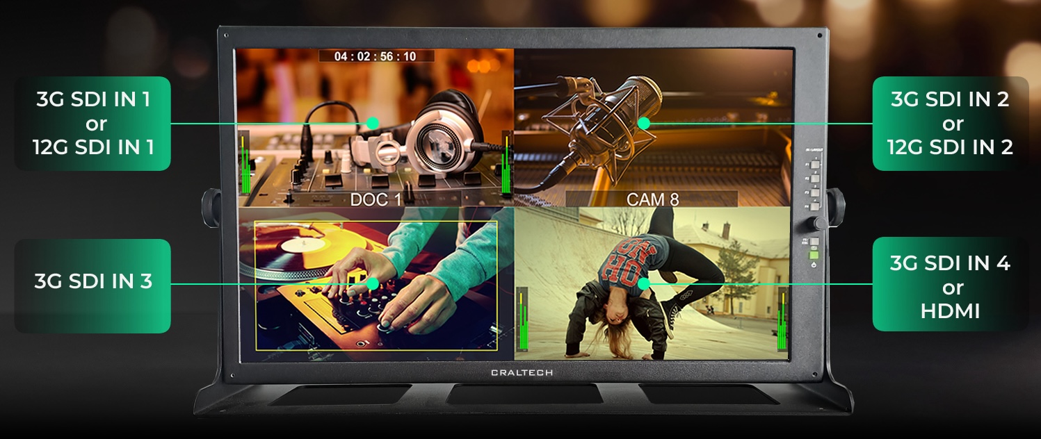 Affichez 4 entrées 3G SDI à l’écran en utilisant le MODE QUAD ou utilisez-les comme boucle active des entrées SDI 1 et 2.
